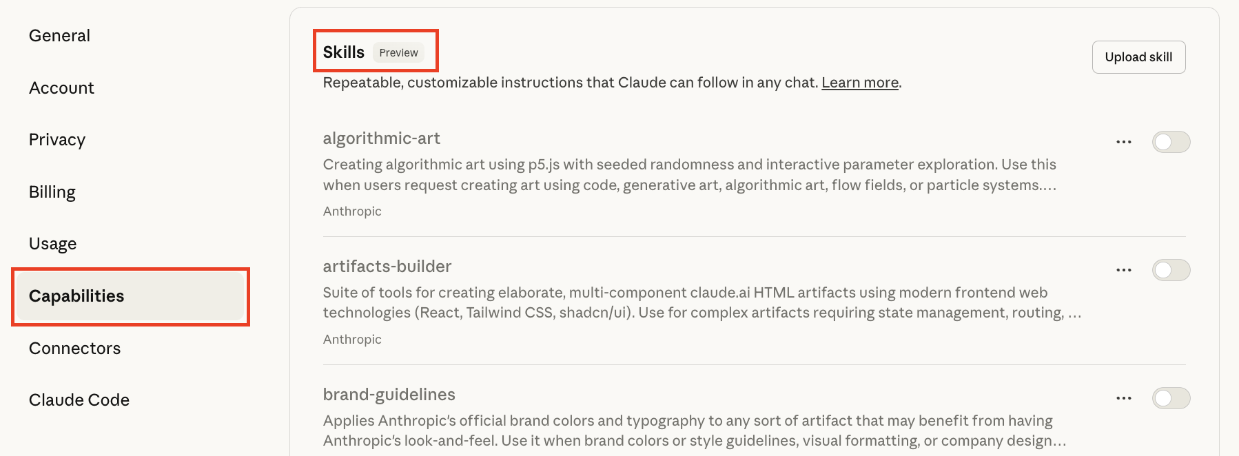 When you finish answering questions, Claude prepares the skill for you. Download it, and then go back to the Skills section in your Settings (under Capabilities). Click the Upload skill button, and upload the skill file you just downloaded. Ensure your skill is turned on (see below), and then get ready to try it!