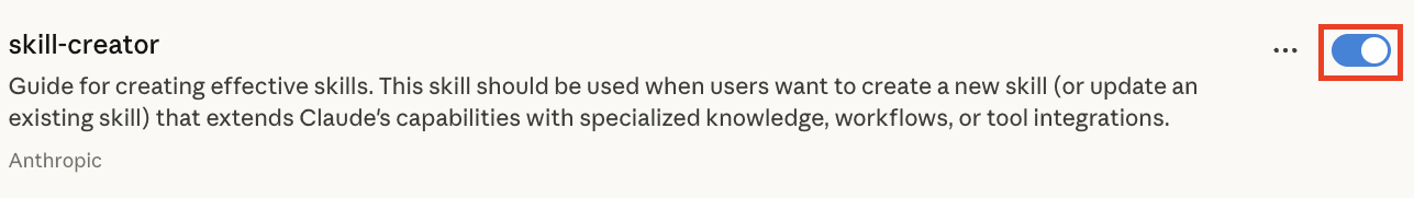 Claude has several built-in skills that you can explore. Scroll down until you see the “skill-creator” skill and turn it on.