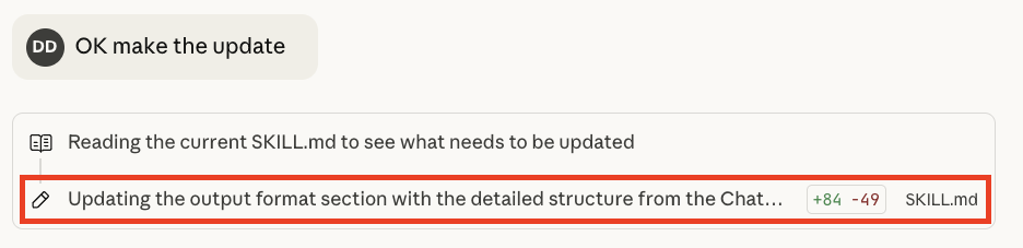 To fix this, go back to where you updated the skill. You should see a section that looks like this, where Claude edits the SKILL.md file: