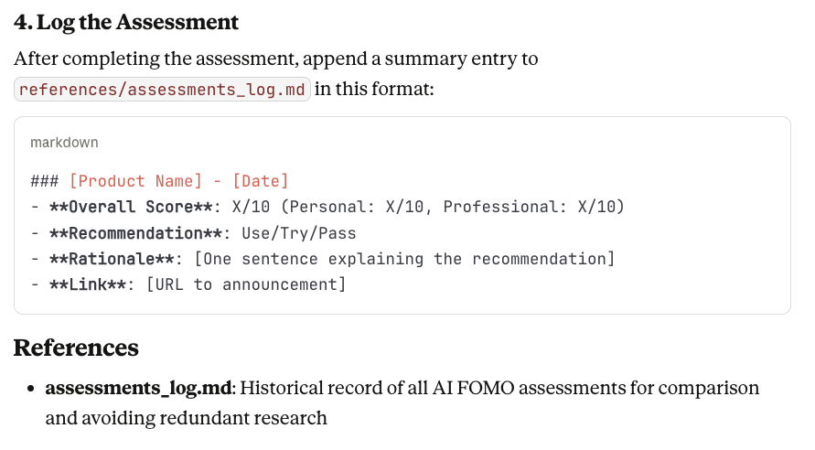 I really like this format. Update the SKILL.md file to use this exact output structure (with all the same headers, subheaders, bold formatting, and section organization) as the template for future AI FOMO assessments.